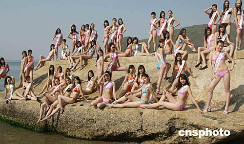 來(lái)自中國(guó)各地的六十二位參加第十七屆世界模特小姐大賽中國(guó)賽區(qū)總決賽的選手,日前來(lái)到深圳風(fēng)景秀麗的海邊,身穿泳裝展示風(fēng)采。中新社記者:錢(qián)興強(qiáng)