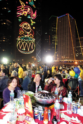中新網(wǎng)12月13日電 據(jù)香港大公報(bào)報(bào)道,第二屆“萬人盆菜宴”昨日在添馬艦舉行,繼去年舊啟德機(jī)場(chǎng)筵開六百六十席,打破全球最多人同一地點(diǎn)吃盆菜的紀(jì)錄后,今年更突破八百席大關(guān),舉行了一場(chǎng)名副其實(shí)的萬人盛宴;顒(dòng)籌委會(huì)主席黃家和希望能將這個(gè)活動(dòng)發(fā)揚(yáng)光大,打造成香港每年一度的盛事。