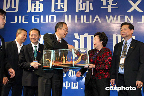 圖為泰國華文民校協(xié)會永遠名譽主席梁冰女士(右二)向國務(wù)院僑辦贈送《鳳舟》,象征華文教育事業(yè)一帆風(fēng)順。作者:張勤