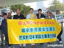 日本軍國主義在中國南京大屠殺67周年之際,香港工會聯合會社會政策委員會成員13日在香港的日本駐香港領事館前舉行游行,聲討日本軍國主義的罪行,為遇難者哀悼。作者:趙振清