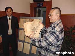 十三日下午,專程從臺(tái)灣趕來(lái)的原南京審判日本戰(zhàn)犯軍事法庭審判長(zhǎng)石美瑜遺孀石沈和玉攜子石南陽(yáng),向侵華日軍南京大屠殺遇難同胞紀(jì)念館捐贈(zèng)了南京審判日本戰(zhàn)犯軍事法庭的起訴書(shū)、判決書(shū)、會(huì)議記錄、詢問(wèn)記錄、照片、書(shū)籍等一百一十七件珍貴史料。圖為捐贈(zèng)現(xiàn)場(chǎng)。作者:王曉紅