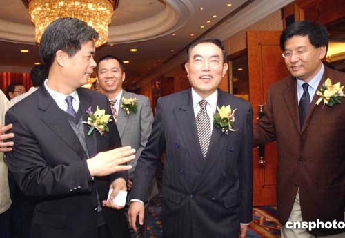 圖為中國(guó)新聞社總編輯郭招金[左]迎接中聯(lián)辦副主任王鳳超[中]蒞臨晚宴。作者:洪少葵