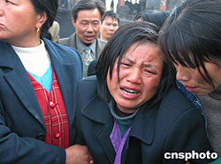 湖南湘潭縣譚家山新立煤礦十三日發(fā)生礦難,正在礦井外焦急等待的遇難礦工家屬悲痛欲絕。作者:劉晶