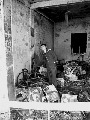 昨日上午11時(shí)左右,記者趕到現(xiàn)場看到,這棟兩層的樓房已被警方用警戒線封鎖,有民警在現(xiàn)場值班守護(hù)。大火將網(wǎng)吧內(nèi)的所有電腦設(shè)備及桌椅燒毀變形,就連距離地面約3米多高懸掛著的吊扇葉片,也被燒得變形后垂直向下,網(wǎng)吧樓上臨街的二樓全部被熏成黑色。