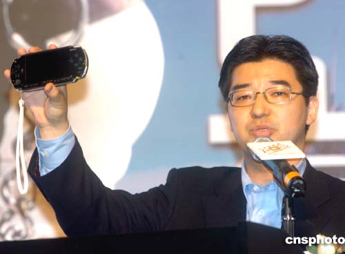 2004年亞洲游戲展17日在香港會展中心開幕﹐日本索尼計算機娛樂PSP業(yè)務籌備室主任茶谷公之先生在開幕式上展示手提游戲機。作者:趙振清