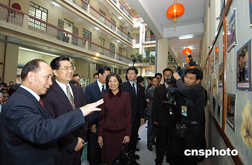 胡錦濤與夫人劉永清在澳門特首何厚鏵的陪同下參觀澳門勞工子弟學(xué)校,受到學(xué)校師生的熱烈歡迎。作者:梁永強(qiáng)