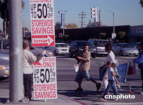 十二月十八日的美國洛杉磯街頭,一位打工男孩在烈日下手舉超級(jí)市場周末圣誕大減價(jià)的指示牌,吸引來往車流人群前往采購。中新社記者:賈國榮