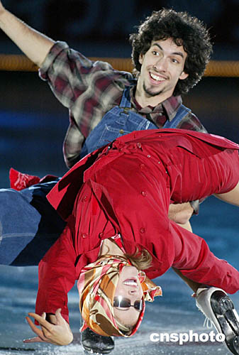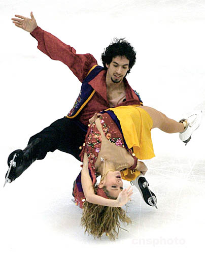 二零零四年十二月十八日晚在北京首都體育館舉行的世界花樣滑冰大獎(jiǎng)賽總決賽冰舞比賽中,各國(guó)選手爭(zhēng)相斗艷,上演了一曲曲美侖美奐的冰上盛宴。圖為奪得亞軍的美國(guó)選手貝爾賓/阿岡索在比賽中。中新社記者:武仲林