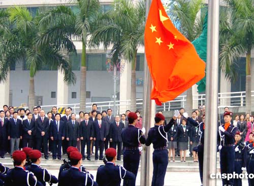 澳門特別行政區(qū)行政長(zhǎng)官何厚鏵、解放軍駐澳門部隊(duì)司令員劉聯(lián)華20日上午出席莊嚴(yán)的升旗儀式,慶祝澳門回歸祖國(guó)五周年。作者:宋吉河