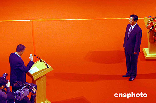 新任特首何厚鏵宣誓就職,國(guó)家主席胡錦濤監(jiān)誓。作者:梁永強(qiáng)