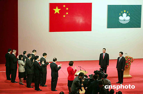澳門(mén)特區(qū)第二屆政府就職典禮在澳門(mén)文化中心舉行,胡錦濤、何厚鏵監(jiān)誓。作者:宗金柱