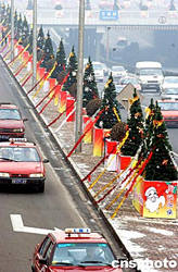 十二月二十四日,北京東三環(huán)農展橋兩邊立起了一百多棵圣誕樹,并在路旁裝點了彩色的塑料花,為節(jié)日增添了喜慶的氣氛。作者:韓藝冰