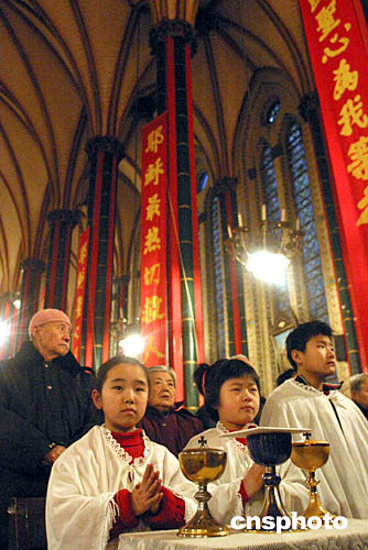 北京西什庫(kù)天主教堂舉行盛大彌撒。圖為奉獻(xiàn)班的孩子在彌撒中。作者:張勤