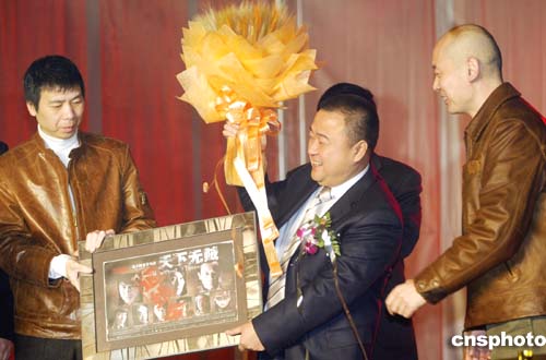 | 十二月三十日,中國(guó)知名家具企業(yè)——曲美家具公司在北京順義的“曲美工業(yè)園”舉行曲美二零零五經(jīng)銷商年會(huì)暨新產(chǎn)品發(fā)布會(huì),歷屆金雞、百花獎(jiǎng)最佳男演員得主、北京曲美家具形象代言人葛優(yōu)(右),與中國(guó)著名導(dǎo)演馮小剛(左)親臨現(xiàn)場(chǎng),向北京曲美家具公司總裁趙瑞海先生(中)贈(zèng)送《天下無(wú)賊》經(jīng)典劇照以表示祝賀。作者:盛佳鵬