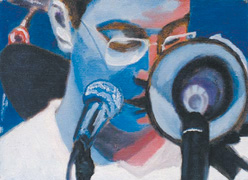 竇唯還特別喜歡用畫(huà)描繪自己樂(lè)隊(duì)演出時(shí)的景象,在昨日曝光的作品中就有兩幅。從畫(huà)面上看,一組搖滾樂(lè)隊(duì)正在舞臺(tái)上盡情揮灑激情,而臺(tái)下的觀(guān)眾也投入欣賞。另外一幅自畫(huà)像更是惹眼,藍(lán)色是畫(huà)的基調(diào),畫(huà)中的竇唯掩在兩只話(huà)筒后面,低頭正沉醉地低唱著。總的看來(lái),竇唯的小畫(huà)未必惹眼但很精妙。不賣(mài)不展