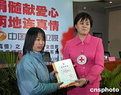 1月3日,湖南省副省長、省紅十字會會長甘霖(右)在長沙向捐獻骨髓的路敏頒發(fā)榮譽證書。來自湖南農(nóng)業(yè)大學的路敏今日將啟程前往北京提供造血干細胞,以救助遼寧14歲的白血病少女任爽。作者:鄧霞