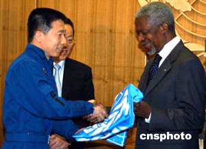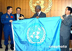 去年今年九月“神五”升空前四十天時,聯(lián)合國維也納辦事處代表安南秘書長,把一面聯(lián)合國旗幟移交給中國常駐維也納代表團,并現(xiàn)場轉交給中國載人航天工程辦公室。后來,這面聯(lián)合國旗和中國國旗伴隨楊利偉,在太空繞地球運行十四圈,行程約六十萬公里。今天,中國載人航天工程代表團訪問紐約聯(lián)合國總部。代表團成員楊利偉把這面旗幟正式移交回聯(lián)合國。