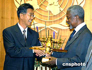 胡世祥把一個金光閃閃的“神舟”五號飛船模型贈送給安南秘書長,并表示,聯(lián)合國在和平利用外層空間等國際事務中發(fā)揮著積極和重要的作用。中國航天界感謝安南秘書長和世界人民對中國航天事業(yè)的支持。中國人民愿與國際同行加強合作,為全人類探索與和平利用外空的事業(yè)作出更大貢獻。