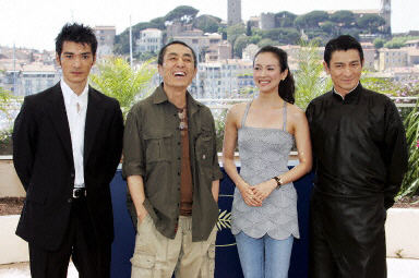 中新網(wǎng)5月20日電 法國戛納當?shù)貢r間5月18日下午2時,報道戛納電影節(jié)的中國記者被請到馬丁內(nèi)斯飯店的露天酒吧,與參展影片《十面埋伏》導(dǎo)演張藝謀以及主演金城武、劉德華、章子怡見面,上!缎侣劤繄蟆返奶嘏捎浾咭苍谄溟g。該報今日刊出了記者對張導(dǎo)及三位主演的完全訪談錄,本網(wǎng)現(xiàn)將全文轉(zhuǎn)載如下: