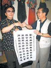 談到變臉風波,曾金貴真誠地對彭登懷說了聲“對不起”!罢裎疫@副字上面寫的,我只是一個老頑童,彭大師才是真正的變臉大師。我今天就是要向彭登懷表達我的歉意,但是川湘情意濃卻是大家都希望的!薄皩,川湘情意濃!”彭登懷連連點頭。