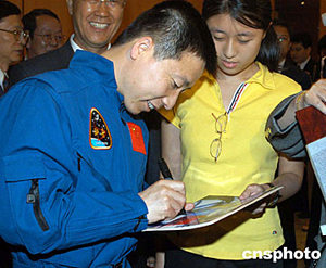 無(wú)論楊利偉多么低調(diào),他在紐約僑胞心目中的“英雄”地位絲毫不能動(dòng)搖。旅美臺(tái)胞花俊雄特意讓在臺(tái)灣的家人寄來(lái)臺(tái)灣的茶葉送給楊利偉,新澤西理工學(xué)院的六名女博士生也委托同學(xué)潘錦功帶著她們珍藏的有楊利偉照片的雜志請(qǐng)楊利偉簽名。