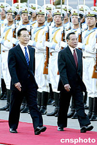 中國國務(wù)院總理溫家寶五月二十日在北京歡迎越南總理潘文凱訪華。中新社記者:鄭萍萍