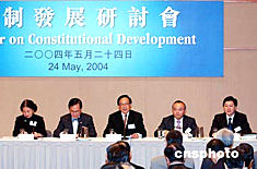 香港政制發(fā)展專責(zé)小組委托中央政組,于5月24日在會(huì)展中心舉辦首場政制發(fā)展研討會(huì),主題為專責(zé)小組發(fā)表的第三號(hào)報(bào)告書中,有關(guān)2007年行政長官及2008年立法會(huì)產(chǎn)生辦法可考慮修改地方。 地方。作者:洪少葵