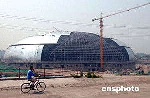五月二十四日,建筑安裝工人正在國家大劇院殼體穹頂施工。國家大劇院橢圓形殼體穹頂自四月一日開始安裝鈦金屬板以來,工程進(jìn)展順利,預(yù)計(jì)六月底完成。中國國家大劇院由法國設(shè)計(jì)師保羅·安德魯設(shè)計(jì)。中新社記者:張煒
