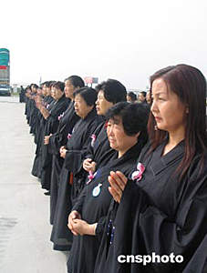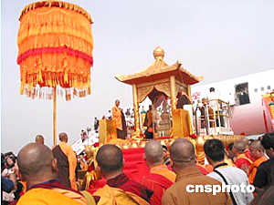 在儀式上,一誠法師、覺光法師、學(xué)誠法師分別拈香,誦經(jīng)、跪拜。來自西安大慈恩寺六十多名僧侶儀仗隊高奏佛樂,數(shù)百名佛家居士齊聲念佛。