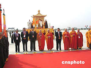 此前,從早晨九時半時開始,在機(jī)場停機(jī)坪舉行了一個約三十分鐘的恭送儀式。參加的人士有中國佛教協(xié)會會長、內(nèi)地恭送團(tuán)團(tuán)長一誠法師;中國佛教協(xié)會副會長圣輝法師;香港佛教聯(lián)合會會長、香港迎請團(tuán)團(tuán)長覺光法師;中國國家宗教事務(wù)局副局長楊同祥、陜西省副省長張偉等,總?cè)藬?shù)為八百多人。