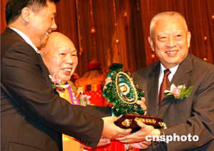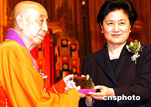 國(guó)家宗教局局長(zhǎng)葉小文、中國(guó)佛教協(xié)會(huì)會(huì)長(zhǎng)一誠(chéng)法師,五月二十六日在香港會(huì)展中心舉行的香港佛教暨各界迎請(qǐng)佛指舍利瞻禮祈福大會(huì)儀式上,向香港特首董建華贈(zèng)送紀(jì)念品。 作者:錢興強(qiáng)