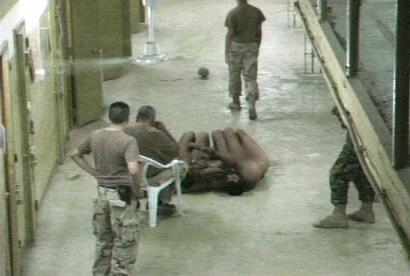 在其中一張照片中,一個(gè)美國(guó)士兵用膝蓋狠狠頂住囚犯的頸部,而這個(gè)囚犯已經(jīng)在地板上縮成一團(tuán)。不愿透露姓名的人士告訴NBC說,照片中有些人是美國(guó)軍事情報(bào)部門的官員,其中一個(gè)據(jù)信是情報(bào)官員的男子正在朝囚犯身上扔擲某種無法辨認(rèn)的物體。