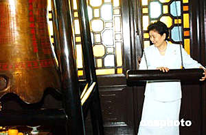 正在香港訪問的全國政協(xié)副主席、中共中央統(tǒng)戰(zhàn)部部長劉延?xùn)|,五月二十七日來到香港觀宗寺參觀,在大雄寶殿敲鐘祈福。 作者:錢興強(qiáng)