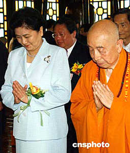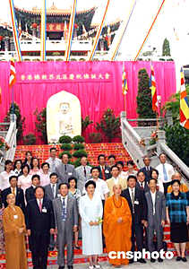 全國政協(xié)副主席、中共中央統(tǒng)戰(zhàn)部部長劉延?xùn)|,五月二十七日來到香港觀宗寺參觀,圖為劉延?xùn)|、國家宗教局局長葉小文、覺光法師、香港特區(qū)民政事務(wù)局局長何志平等一起在大雄寶殿前合影留念。作者:錢興強(qiáng)