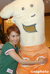歌星董敏莉5月28日在香港出席無(wú)線(xiàn)電視《雅典奧運(yùn)·上下一心共創(chuàng)新里程》誓師大會(huì),董敏莉被可愛(ài)的奧運(yùn)吉祥公仔吸引。作者:鄧慶樂(lè)