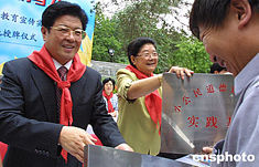 二十九日,由中國婦聯(lián)主辦的“為國教子、以德育人”家庭教育實踐活動暨中國小公民道德建設活動實踐基地授牌儀式在中國兒童中心舉行。圖為中共中央政治局委員王兆國(左)、中國婦聯(lián)主席顧秀蓮為承辦活動的基地代表授牌。中新社記者:廖文靜