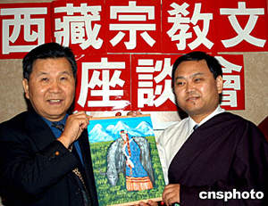 美東時(shí)間五月三十一日,正在紐約訪問的中國(guó)藏學(xué)家、活佛代表團(tuán)參加紐約亞美文化協(xié)會(huì)主辦的“西藏宗教文化座談會(huì)”。中央民族大學(xué)副校長(zhǎng)喜饒尼瑪(右)向亞美文化協(xié)會(huì)會(huì)長(zhǎng)黃哲操(左)贈(zèng)送手繪唐卡、史詩《格薩爾》唐卡圖冊(cè)等禮物。作者:趙海燕