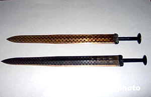 六月初,湖北省博物館專家對所謂“高仿真”的越王勾踐劍進行了技術(shù)鑒定,有關(guān)專家認(rèn)為所謂“高仿真”劍與真品差異很大,并聲明“高仿真”行為不合法,應(yīng)立即停止。近日,湖北荊州有人聲稱“破解”了越王勾踐劍千年不銹之謎,準(zhǔn)備建立生產(chǎn)基地批量生產(chǎn)“高仿真”劍。圖為越王勾踐劍(下)與“高仿真”劍(上)的對比。作者:艾啟平