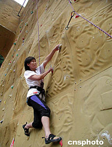 二零零四中國(guó)廣東懷集國(guó)際攀巖邀請(qǐng)賽六月六日下午在廣東懷集“國(guó)家攀巖訓(xùn)練基地”降下帷幕。圖為中國(guó)選手在比賽中。作者:黃耀輝