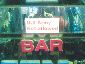 一些酒吧的老板也承認(rèn)這樣做帶有歧視色彩,但除此之外他們也沒有別的辦法。他們必須在警察趕到前制止打架,否則酒吧就會被關(guān)閉。在采取不讓美國大兵進(jìn)酒吧的政策后,酒吧現(xiàn)在不再有麻煩了。