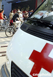 二○○四年六月七日,全國(guó)統(tǒng)一高考北京地區(qū)各考場(chǎng)外,特別為考生設(shè)置了醫(yī)療服務(wù)急救專用車,以確保高考順利進(jìn)行。中新社記者:張勤