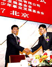 中國青少年發(fā)展基金會常務副秘書長涂猛(左),二○○四年六月初在北京人民大會堂接受一家企業(yè)捐款時表示,希望工程起動十五年來,共收到社會各界捐款二十四億人民幣,該捐款實行“一對一”制度,即每一筆款項都對應某學校某學生,捐款人和學生彼此擁有對方的聯系卡片。作者:王麗南