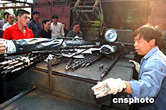六月八日下午,發(fā)生坍塌事故的北京大安山煤礦的工人正準(zhǔn)備將大批鉆桿運往井下。六月六日,位于北京郊區(qū)的大安山煤礦發(fā)生礦井塌冒事故,井下十名礦工被困。為了直接進(jìn)入坍塌地點營救被困礦工,救援人員目前正在全力打通巷道,如果進(jìn)展順利,九日上午可望打通。六月八日,救援人員已成功向坍塌地點注入氧氣。中新社記者:張煒