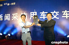 六月八日晚,一汽集團在北京國際會議中心舉行新聞記者見面會,一汽老總竺延風等在見面會上解答了眾多記者的提問,會后舉行新聞采訪用車的交車儀式,第一汽車集團公司副總經理安德武向媒體代表頒發(fā)“車鑰匙”。中新社記者:盛佳鵬