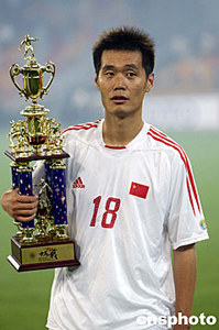 二○○六年德國(guó)世界杯男子足球賽亞洲區(qū)預(yù)賽中國(guó)隊(duì)對(duì)馬來(lái)西亞隊(duì)的比賽六月九日晚在天津舉行,中國(guó)隊(duì)以4:0取勝,獲得預(yù)選賽小組賽三連勝。李霄鵬獨(dú)中二元,被評(píng)為本場(chǎng)比賽最佳球員。中新社記者:毛建軍