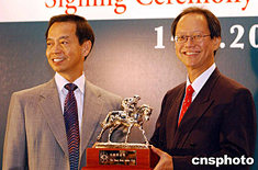 香港國泰航空于6月14日與香港賽馬會簽訂一份為期三年的合約,贊助香港賽馬會舉辦 “香港國際賽事”。圖為香港賽馬會行政總裁黃至剛[左]向香港國泰航空董事兼常務(wù)總裁陳南祿贈送賽馬會禮物。中新社記者:趙振清