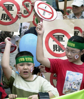 盡管天氣炎熱,但游行民眾情緒相當(dāng)激昂,有人攜家?guī)Ь炜倓?dòng)員,也有民眾用行動(dòng)劇的演出,表達(dá)反對(duì)軍購(gòu)的決心。