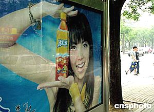 周日的北京街頭,由臺灣藝人張惠妹擔(dān)任形象代言人的某品牌飲料廣告牌依然醒目。中新社記者:賈國榮