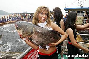 德國旅游小姐懷抱著大魚,喜悅之情溢于言表。中新社記者:盛佳鵬