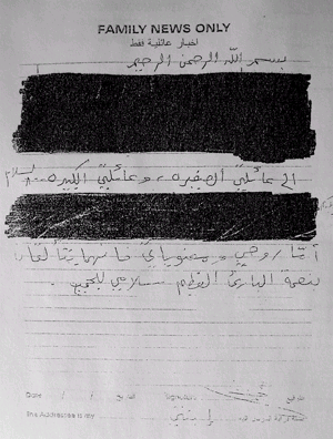 信的開頭寫道:“以慈悲的神的名義”,接下來有6行字被劃掉,再往下是“向我的小家庭和大家庭問好”,下面又有3行字被劃掉,接下來的文字是“感謝老天,我的精神很好,我的士氣很高。向所有人問好。”。這封信經(jīng)過了駐伊美軍的嚴格審查,其實際內(nèi)容基本已經(jīng)不存在。魯沙旦說:“三分之二的內(nèi)容被劃掉了,只剩下17個字,根本無法理解其原意!(章田)